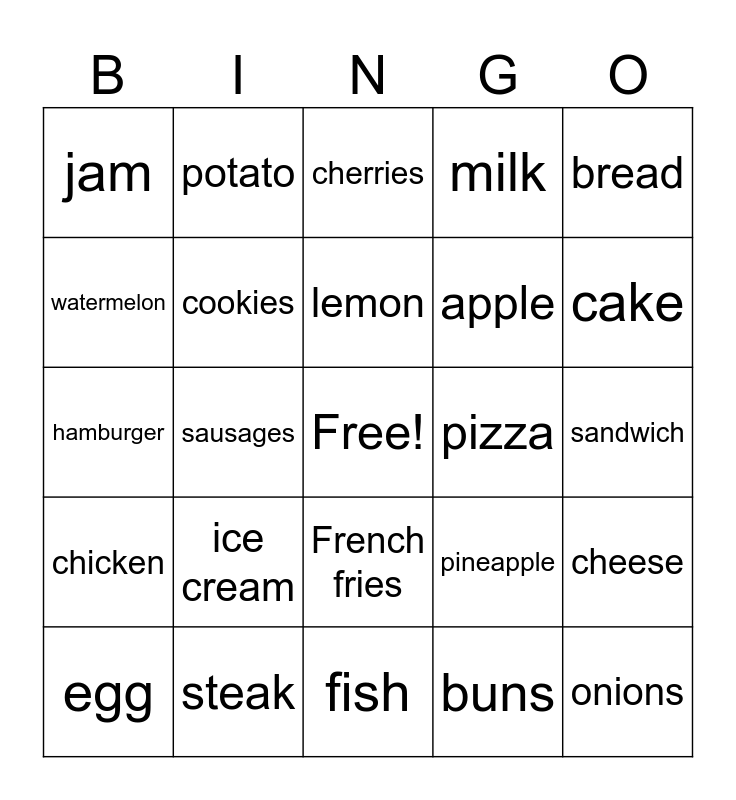 This bingo card has a free space and 24 words: ice cream, steak, lemon, egg, bread, jam, watermelon, potato, pizza, French fries, apple, hamburger, pineapple, cheese, cookies, buns, sandwich, cherries, cake, sausages, onions, chicken, milk and fish.