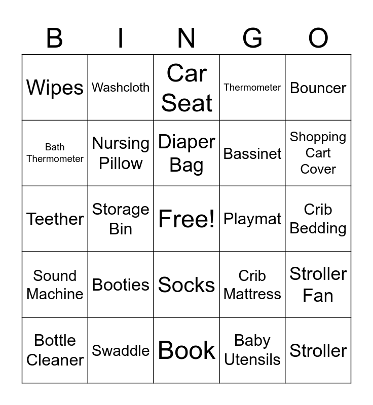 This bingo card has a free space and 43 words: Baby Monitor, Stroller, Bottles, Bottle Cleaner, Burp Cloths, Baby Utensils, Car Seat, Play Pen, Bouncer, Swaddle, Thermometer, Playmat, Socks, Booties, Headband, Book, Plushie, Teether, Bib, Shopping Cart Cover, Washcloth, Bathtub/Support, Bath Toys, Wipes, Onesie, Crib Bedding, Sippy Cup, Bottle Warmer, Crib Mattress, Sound Machine, Baby Car Camera, Stroller Fan, Milk Storage Bags, Storage Bin, Nursery Decor, Pacifier, Rattle, Diaper Bag, Bath Thermometer, Bassinet, Baby Swing, Nursing Pillow and Baby Clothing Hangers.