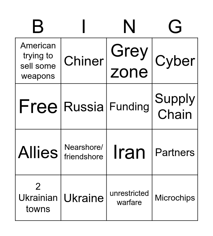 This bingo card has 16 words: Ukraine, Partners, Grey zone, American trying to sell some weapons, Allies, Chiner, Iran, unrestricted warfare, Free, Russia, 2 Ukrainian towns, Cyber, Nearshore/ friendshore, Supply Chain, Funding and Microchips.