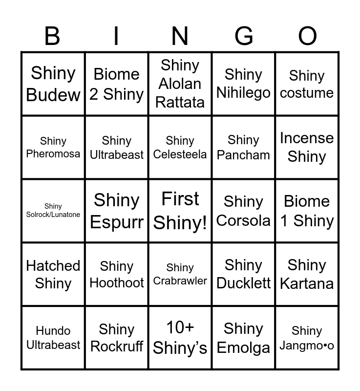 This bingo card has a free space and 30 words: Shiny Rockruff, Biome 3 Shiny, Shiny Espurr, Biome 4 Shiny, Shiny Budew, Shiny Alolan Rattata, Shiny Ultrabeast, Shiny Crabrawler, Shiny Corsola, 10+ Shiny’s, Biome 1 Shiny, Shiny Jangmo•o, Shiny Emolga, Shiny Pikachu, Incense Shiny, Shiny Unown, Shiny Ducklett, Hatched Shiny, Shiny Hoothoot, Shiny costume, Shiny Solrock/Lunatone, Shiny Golett, Biome 2 Shiny, Shiny Pancham, Shiny Pheromosa, Shiny Nihilego, Shiny Kartana, Hundo Ultrabeast, Shiny Celesteela and Shiny Xurkitree.