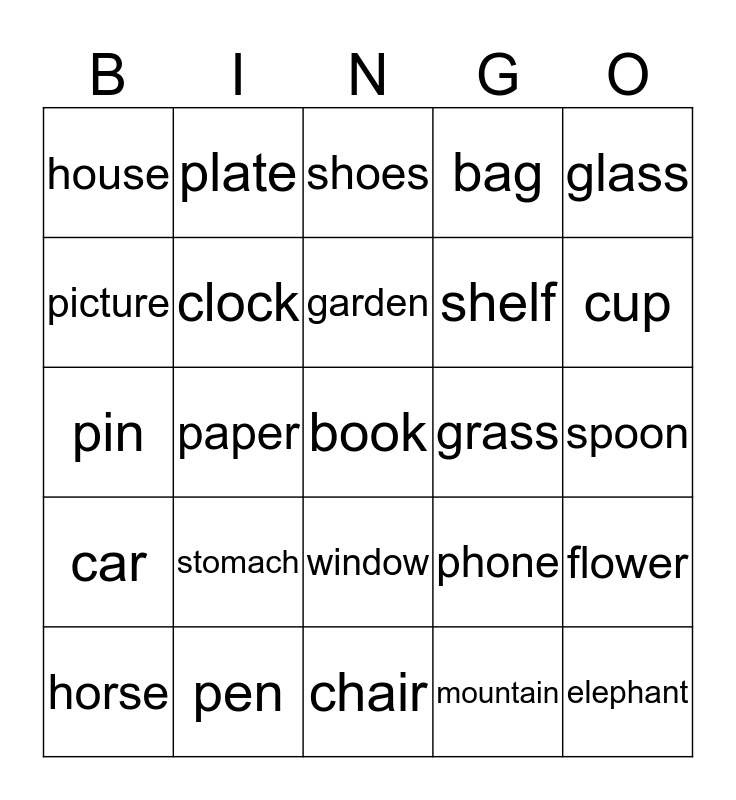 This bingo card has a free space and 24 words: stomach, pen, garden, horse, glass, house, picture, plate, grass, window, shelf, pin, phone, flower, clock, mountain, spoon, shoes, cup, paper, elephant, car, bag and chair.