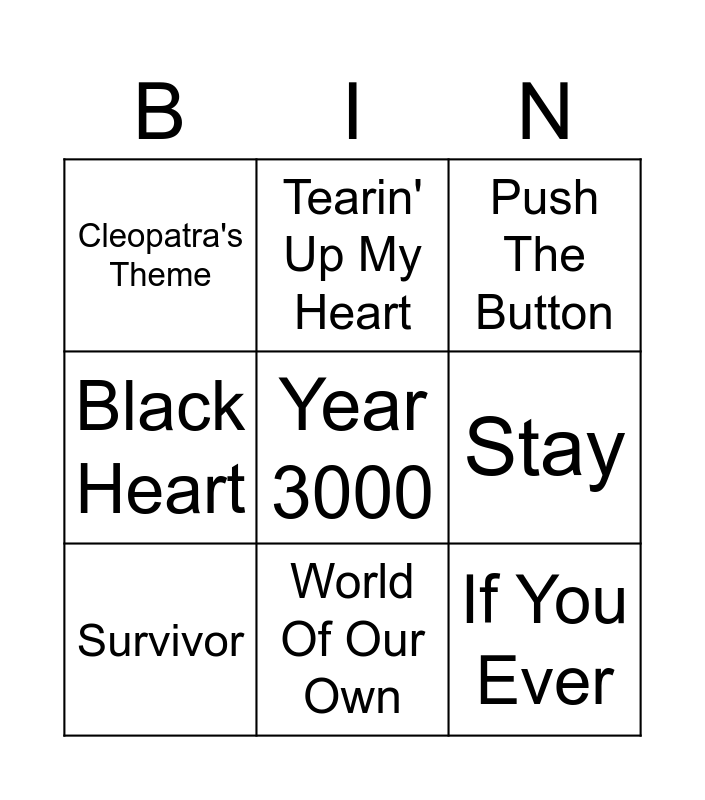 This bingo card has 34 words: Spice Up Your Life, If Ya Gettin' Down, C'est La Vie, Wings, Everybody (Backstreet's Back), Survivor, Year 3000, Scandalous, Tearin' Up My Heart, Sound Of The Underground, World Of Our Own, Push The Button, All Time Low, No Scrubs, One Love, Beep, Star Girl, Beat Again, Pure Shores, No Matter What, Whole Again, Never Forget, Cleopatra's Theme, Crossroads, Don't Let Go, Freak Me, Black Heart, You Got It (The Right Stuff), If You Ever, Stay, Can We Dance, Right Here, Caught In The Middle and Venus.