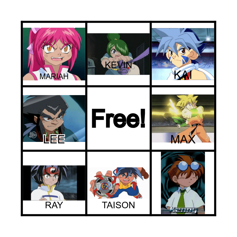 This bingo card has 8 images, a free space and 7 words: MAX, KAI, KEVIN, RAY, MARIAH, LEE and TAISON.