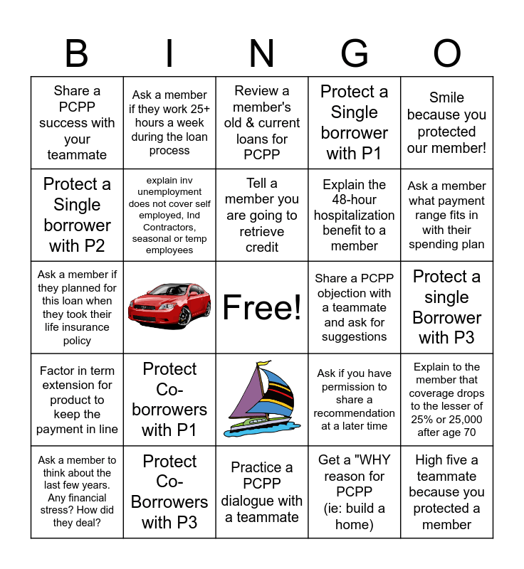 This bingo card has 3 images, a free space and 24 words: Ask if you have permission to share a recommendation at a later time, Protect Co-borrowers with P2, Explain the 48-hour hospitalization benefit to a member, Practice a PCPP dialogue with a teammate, Protect a Single borrower with P2, Review a member's old & current loans for PCPP, Ask a member if they work 25+ hours a week during the loan process, Factor in term extension for product to keep the payment in line, Share a PCPP objection with a teammate and ask for suggestions, Explain to the member that coverage drops to the lesser of 25% or 25,000 after age 70, Ask a member if they planned for this loan when they took their life insurance policy, Protect a Single borrower with P1, Ask a member to think about the last few years. Any financial stress? How did they deal?, Protect Co-Borrowers with P3, Ask a member what payment range fits in with their spending plan, Check for understanding of the protection offer you have made, explain inv unemployment does not cover self employed, Ind Contractors, seasonal or temp employees, Tell a member you are going to retrieve credit, Protect Co-borrowers with P1, Share a PCPP success with your teammate, Protect a single Borrower with P3, Get a "WHY reason for PCPP (ie: build a home), High five a teammate because you protected a member and Smile because you protected our member!.