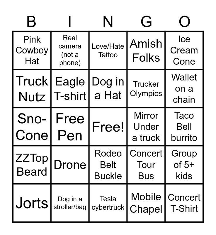 This bingo card has a free space and 35 words: Yosemite Sam, Boots & Shorts, Jamboree T-shirt (non staff), Eagle T-shirt, Rodeo Belt Buckle, Amish Folks, Truck Nutz, Chihuahua, Dog in a Hat, Pork Chop, Sno-Cone, Ice Cream Cone, Brand Mascot, Bulldog, Pink Cowboy Hat, Mirror Under a truck, Mobile Chapel, Free Pen, ZZTop Beard, Concert T-Shirt, Concert Tour Bus, Jorts, Group of 5+ kids, Dog in a stroller/bag, Love/Hate Tattoo, Wallet on a chain, The Horse Truck, Fireworks, Trucker Olympics, Taco Bell burrito, Hawkeye hat (on a person), Tesla cybertruck, Drone, Real camera (not a phone) and News station.