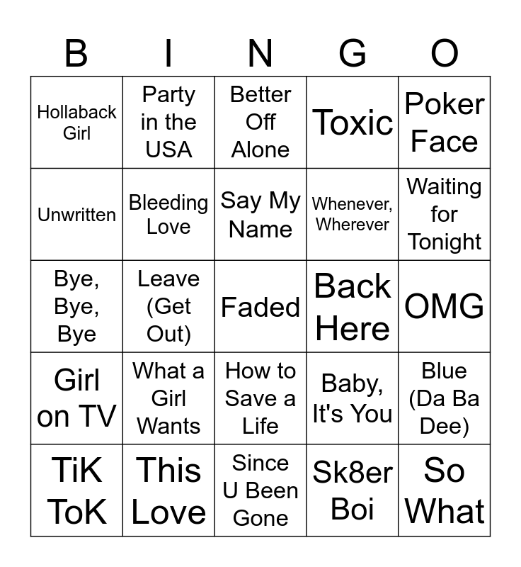 This bingo card has 25 words: What a Girl Wants, Since U Been Gone, Say My Name, TiK ToK, Poker Face, Hollaback Girl, Unwritten, Party in the USA, Back Here, How to Save a Life, Whenever, Wherever, Bye, Bye, Bye, Baby, It's You, Blue (Da Ba Dee), Bleeding Love, So What, OMG, Better Off Alone, Waiting for Tonight, Leave (Get Out), Faded, This Love, Girl on TV, Toxic and Sk8er Boi.