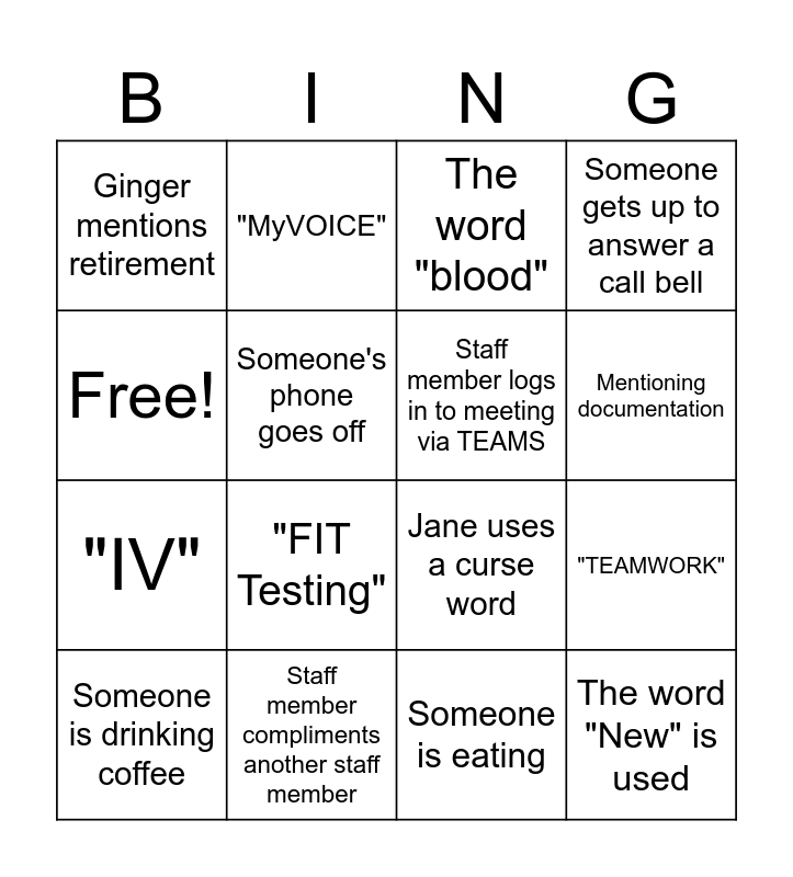 This bingo card has 16 words: Staff member compliments another staff member, "TEAMWORK", The word "blood", Ginger mentions retirement, "IV", "MyVOICE", Jane uses a curse word, Someone is eating, Free!, Someone's phone goes off, Someone is drinking coffee, Someone gets up to answer a call bell, "FIT Testing", Mentioning documentation, Staff member logs in to meeting via TEAMS and The word "New" is used.