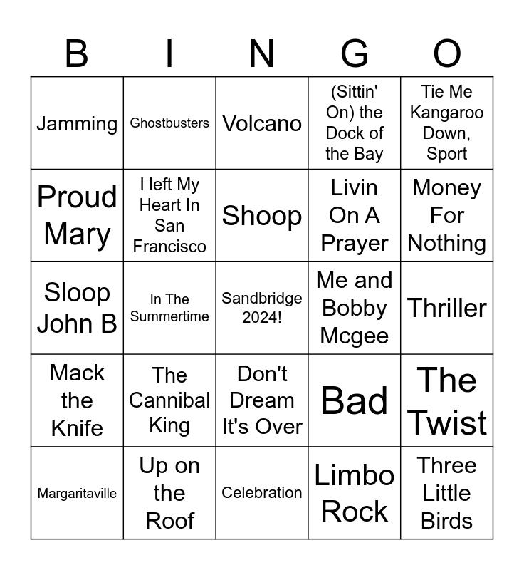 This bingo card has a free space and 62 words: Under The Boardwalk, Up on the Roof, We Are Family, Mack the Knife, Summertime, Summertime, Summer Wind, I left My Heart In San Francisco, Stand By Me, Livin On A Prayer, Soul Man, (Sittin' On) the Dock of the Bay, September, Proud Mary, Puff The Magic Dragon, The Lion Sleeps Tonight, Jamming, Three Little Birds, Tie Me Kangaroo Down, Sport, The Fox (What Does The Fox Say), Shoop, Me and Bobby Mcgee, Volcano, Margaritaville, Limbo Rock, Tom Dooley, Baby Shark, M.T.A., Wipeout, The Twist, Brandy (You're a Fine Girl), Games People Play, Love Potion Number Nine, There is a Special Feel, If I Had a Hammer, Thriller, Ghostbusters, Yo Ho (A Pirate's Life For Me), Up On the Roof, In The Summertime, Ride Captain Ride, Sloop John B, Surfin' Safari, The Cannibal King, Werewolves of London, Money For Nothing, Bad, Billie Jean, Sweet Caroline, One Love, Easy, Don't Dream It's Over, Celebration, I Want a New Drug, When You're Talking in Your Sleep, Wild Thing, Funky Cold Medina, Louie Louie, Wooly Bully, Life goes pon, Beyond the sea, Peg and I wish.