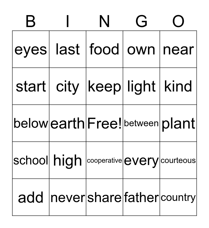 This bingo card has a free space and 24 words: high, never, keep, add, near, eyes, start, last, between, cooperative, light, below, every, courteous, city, father, plant, food, kind, earth, country, school, own and share.