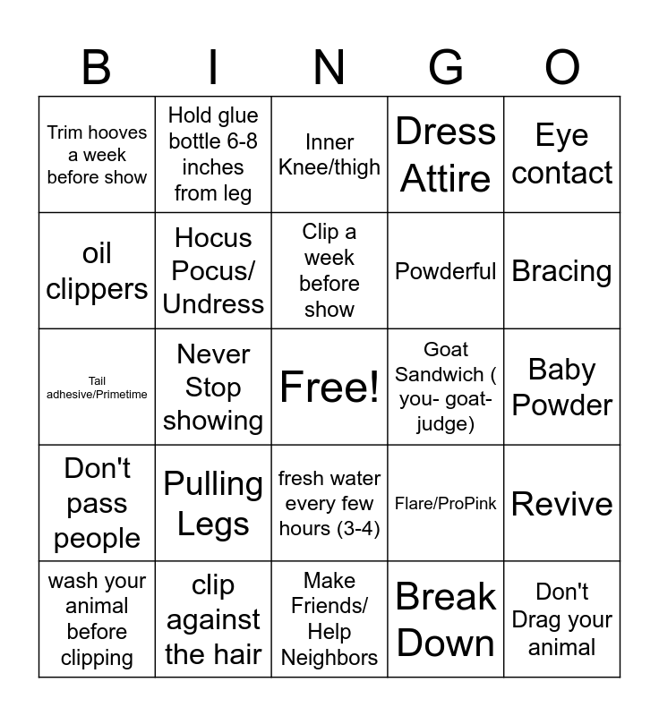 This bingo card has a free space and 24 words: Pulling Legs, clip against the hair, Clip a week before show, wash your animal before clipping, Eye contact, Trim hooves a week before show, oil clippers, Hold glue bottle 6-8 inches from leg, Goat Sandwich ( you- goat- judge), fresh water every few hours (3-4), Powderful, Tail adhesive/Primetime, Flare/ProPink, Revive, Hocus Pocus/ Undress, Break Down, Baby Powder, Inner Knee/thigh, Bracing, Never Stop showing, Don't Drag your animal, Don't pass people, Dress Attire and Make Friends/ Help Neighbors.