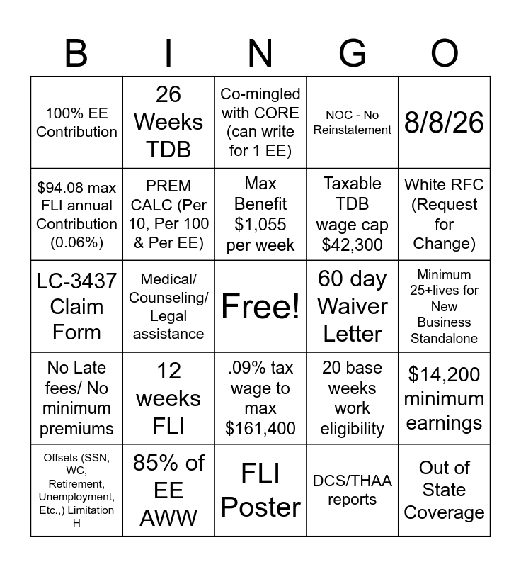 This bingo card has a free space and 24 words: 12 weeks FLI, 85% of EE AWW, Max Benefit $1,055 per week, Offsets (SSN, WC, Retirement, Unemployment, Etc.,) Limitation H, 8/8/26, 100% EE Contribution, $94.08 max FLI annual Contribution (0.06%), 26 Weeks TDB, 60 day Waiver Letter, .09% tax wage to max $161,400, Taxable TDB wage cap $42,300, LC-3437 Claim Form, 20 base weeks work eligibility, $14,200 minimum earnings, PREM CALC (Per 10, Per 100 & Per EE), DCS/THAA reports, Minimum 25+lives for New Business Standalone, Co-mingled with CORE (can write for 1 EE), White RFC (Request for Change), Medical/ Counseling/ Legal assistance, Out of State Coverage, No Late fees/ No minimum premiums, NOC - No Reinstatement and FLI Poster.