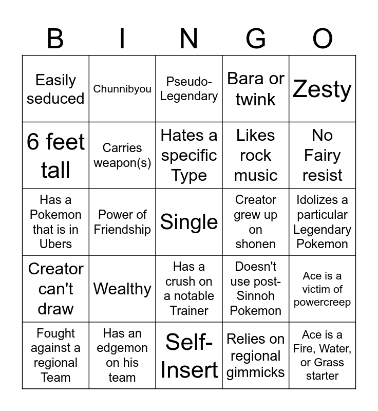 This bingo card has a free space and 24 words: Wealthy, Has an edgemon on his team, Hates a specific Type, Fought against a regional Team, Zesty, Easily seduced, 6 feet tall, Chunnibyou, Creator grew up on shonen, Has a crush on a notable Trainer, Likes rock music, Has a Pokemon that is in Ubers, Doesn't use post-Sinnoh Pokemon, Ace is a victim of powercreep, Carries weapon(s), Relies on regional gimmicks, Idolizes a particular Legendary Pokemon, Pseudo-Legendary, No Fairy resist, Power of Friendship, Ace is a Fire, Water, or Grass starter, Creator can't draw, Bara or twink and Self-Insert.