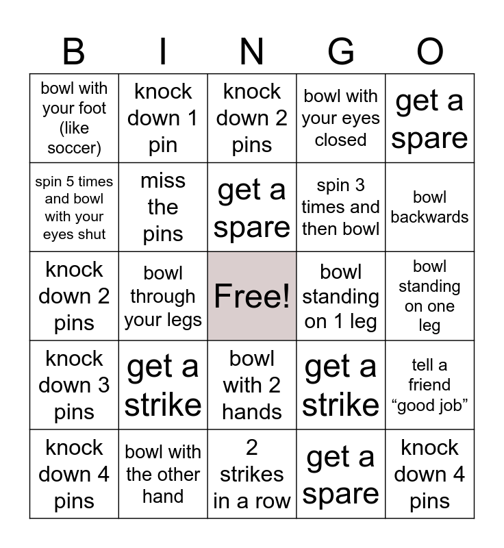 This bingo card has a free space and 24 words: get a strike, bowl with the other hand, get a spare, knock down 4 pins, get a spare, bowl with your foot (like soccer), spin 5 times and bowl with your eyes shut, knock down 1 pin, bowl standing on 1 leg, bowl with 2 hands, spin 3 times and then bowl, knock down 2 pins, get a strike, tell a friend “good job”, miss the pins, get a spare, bowl standing on one leg, knock down 2 pins, bowl backwards, bowl through your legs, knock down 4 pins, knock down 3 pins, bowl with your eyes closed and 2 strikes in a row.