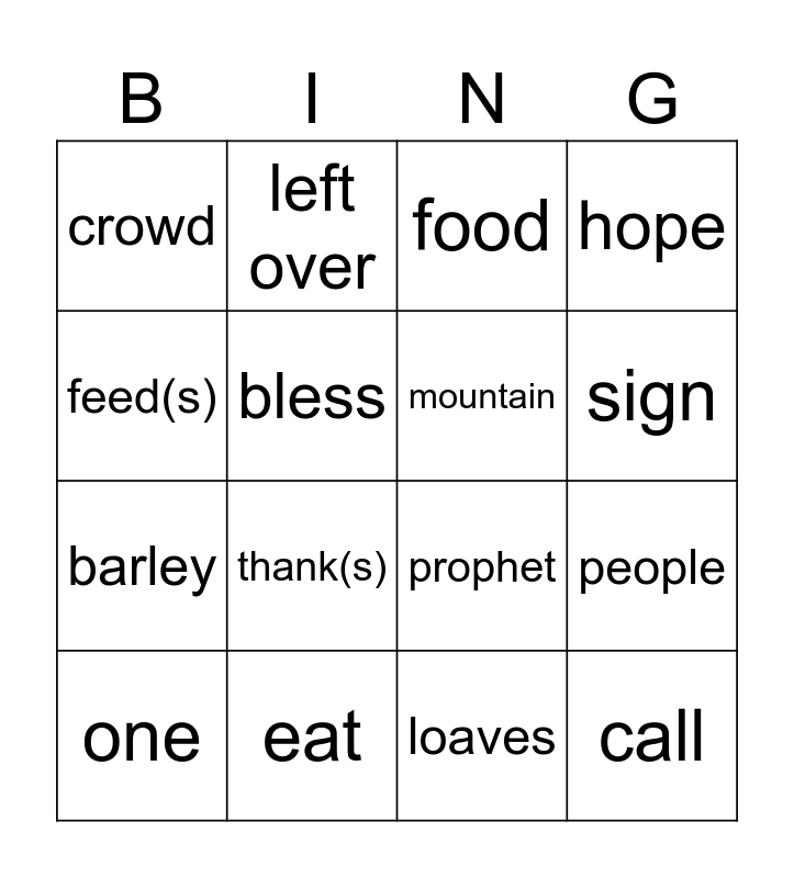 This bingo card has 16 words: eat, people, food, crowd, barley, left over, prophet, loaves, feed(s), bless, one, hope, thank(s), sign, mountain and call.