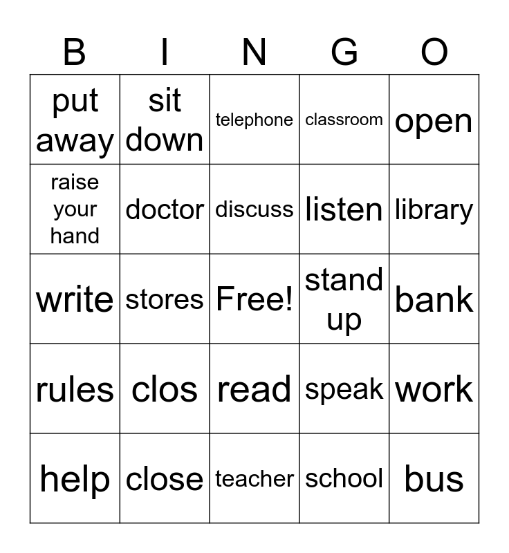 This bingo card has a free space and 24 words: clos, close, discuss, help, open, put away, raise your hand, sit down, stand up, read, listen, write, speak, work, doctor, school, bank, telephone, library, stores, bus, rules, classroom and teacher.