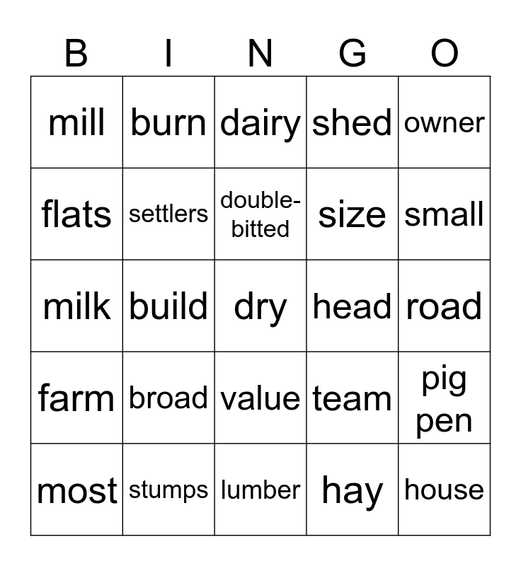 This bingo card has a free space and 24 words: most, broad, double-bitted, hay, owner, mill, burn, dairy, head, road, milk, settlers, team, pig pen, flats, stumps, lumber, shed, small, farm, build, value, size and house.