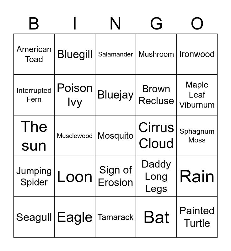 This bingo card has a free space and 36 words: Sumac, Raspberry, Gooseberry, Poison Ivy, Daddy Long Legs, Jumping Spider, Bluejay, Rooster, Ironwood, Redwood, Musclewood, Mushroom, Cumulus Cloud, Cirrus Cloud, Maple Leaf Viburnum, American Toad, Yellow Birch, Loon, Painted Turtle, Salamander, Sphagnum Moss, Rain, Eagle, Seagull, Tamarack, Bluegill, The sun, Snapping Turtle, Brown Recluse, Interrupted Fern, Bracken Fern, 5 pieces of litter (put in trash), Bat, Sign of Erosion, Animal Tracks and Animal Scat.