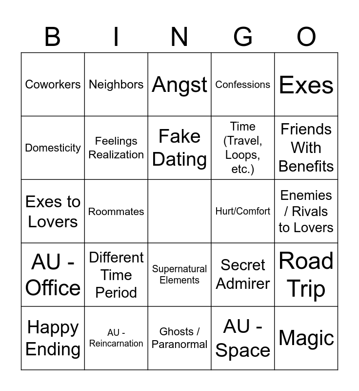 This bingo card has a free space and 80 words: 3+1 / 5+1 Times, A/B/O Elements, Angst, Angst and Fluff, Animals / Pets, Arranged Marriage, Based on Other Media, Blind Date, Canon Compliant, Celestial Beings, Childhood Friends, Childhood Sweethearts, Confessions, Coworkers, Dares, Domesticity, Didn’t Know They Were Dating, Different Time Period, Dreams, Enemies / Rivals to Lovers, Established Relationship, Exes, Exes to Lovers, Fake Dating, Feelings Realization, Firsts, Fluff, Food / Cooking, Forbidden Love, Found Family, Friends With Benefits, Friends to Lovers, Ghosts / Paranormal, Handholding, Happy Ending, Hurt/Comfort, Hybrids, Idiots in Love, Kidfic, Magic, Marriage / Married Life / Weddings, Marriage of Convenience, Mistaken Identity, Mutual Pining, Nature Imagery, Neighbors, One Night Stands, Partners in Crime, Pining, Rivals with Benefits, Road Trip, Roommates, Secret Admirer, Sharing a Bed, Sickfic, Slice of Life, Slow Burn, Soulmates, Strangers to Lovers, Supernatural Elements, Time (Travel, Loops, etc.), Trapped Together, AU - Bodyguard, AU - Canon Divergent, AU - College / University, AU - Fantasy, AU - Inspired by SKZ MV, AU - Modern, AU - Modern with Magic, AU - Non-Idol Celebrity, AU - Office, AU - Reincarnation, AU - Rock Band, AU - Royalty, AU - Shops, AU - Small Town, AU - Space, AU - Spies / Secret Agents, AU - Vampires and AU - Werewolves.