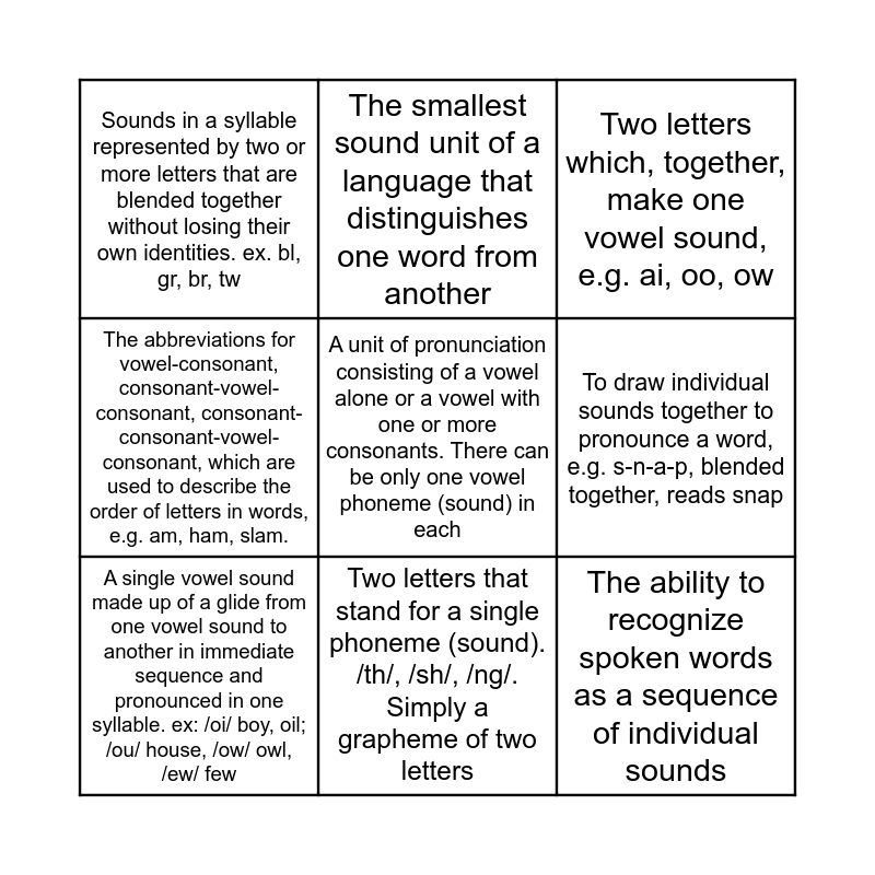 This bingo card has a free space and 8 words: To draw individual sounds together to pronounce a word, e.g. s-n-a-p, blended together, reads snap, Two letters which, together, make one vowel sound, e.g. ai, oo, ow, The smallest sound unit of a language that distinguishes one word from another, A single vowel sound made up of a glide from one vowel sound to another in immediate sequence and pronounced in one syllable. ex: /oi/ boy, oil; /ou/ house, /ow/ owl, /ew/ few, Sounds in a syllable represented by two or more letters that are blended together without losing their own identities. ex. bl, gr, br, tw, The ability to recognize spoken words as a sequence of individual sounds, The abbreviations for vowel-consonant, consonant-vowel-consonant, consonant-consonant-vowel-consonant, which are used to describe the order of letters in words, e.g. am, ham, slam. and Two letters that stand for a single phoneme (sound). /th/, /sh/, /ng/. Simply a grapheme of two letters.