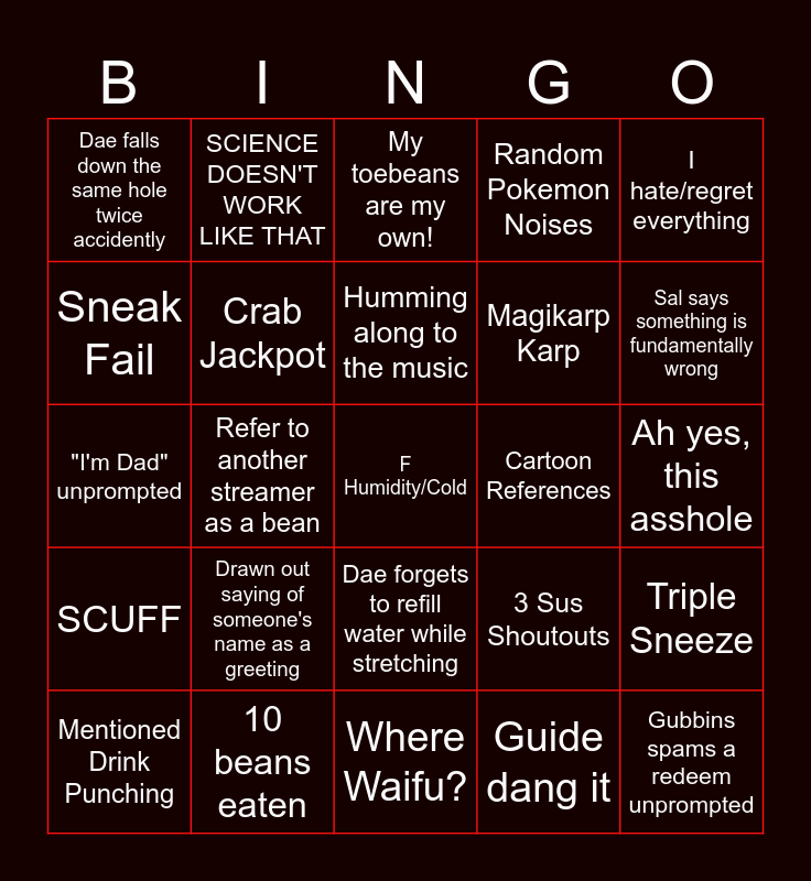 This bingo card has 35 words: Go home controller you're drunk, This is Bullshit, Precious /chonky Baby, Crab Jackpot, Dae forgets to refill water while stretching, Random Pokemon Noises, Sneak Fail, Why are you like this???, Humming along to the music, Roll of Suffering dupe 2x, "I'm Dad" unprompted, I hate/regret everything, Free!, Viewer shocked by hidden command, Dae falls down the same hole twice accidently, Cartoon References, Guide dang it, Refer to another streamer as a bean, SCUFF, F Humidity/Cold, 3 Sus Shoutouts, Mentioned Drink Punching, Triple Sneeze, 10 beans eaten, My toebeans are my own!, Sal says something is fundamentally wrong, Gubbins spams a redeem unprompted, FOUND A BUG, Magikarp Karp, Ah yes, this asshole, Streamer Brain engage, Where Waifu?, Drawn out saying of someone's name as a greeting, SCIENCE DOESN'T WORK LIKE THAT and Three instances of Dae Growls.