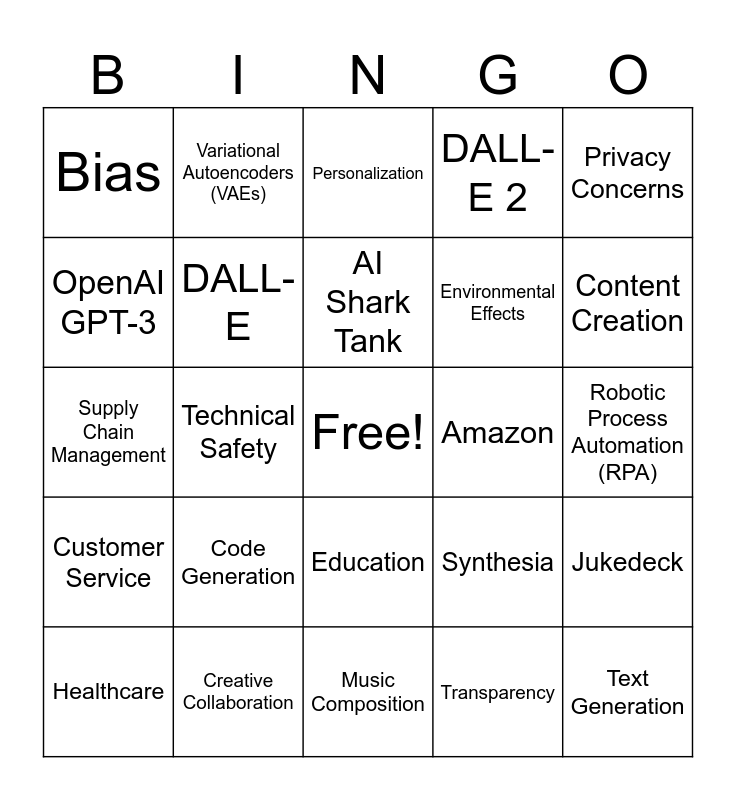 This bingo card has a free space and 47 words: Generative AI, Text Generation, Image Creation, Music Composition, Code Generation, Generative Adversarial Networks (GANs), Variational Autoencoders (VAEs), Transformers, OpenAI GPT-3, OpenAI GPT-4, DALL-E, DALL-E 2, Jukedeck, Synthesia, GitHub Copilot, Tableau, AI Shark Tank, Amazon, Ethical Concerns, Privacy Concerns, Technical Safety, Transparency, Bias, Environmental Effects, Dependency on AI, Content Creation, Healthcare, Fashion & Design, Education, Customer Service, Gaming, Algorithmic Trading, Deepfakes, Hyper-Personalization, Automation, Creative Collaboration, Robotic Process Automation (RPA), Real World Impact, Ethical Discussion, Future Trends, Innovation, Personalization, Supply Chain Management, Autonomous AI, Business Processes, Creative Fields and AI-driven Automation.