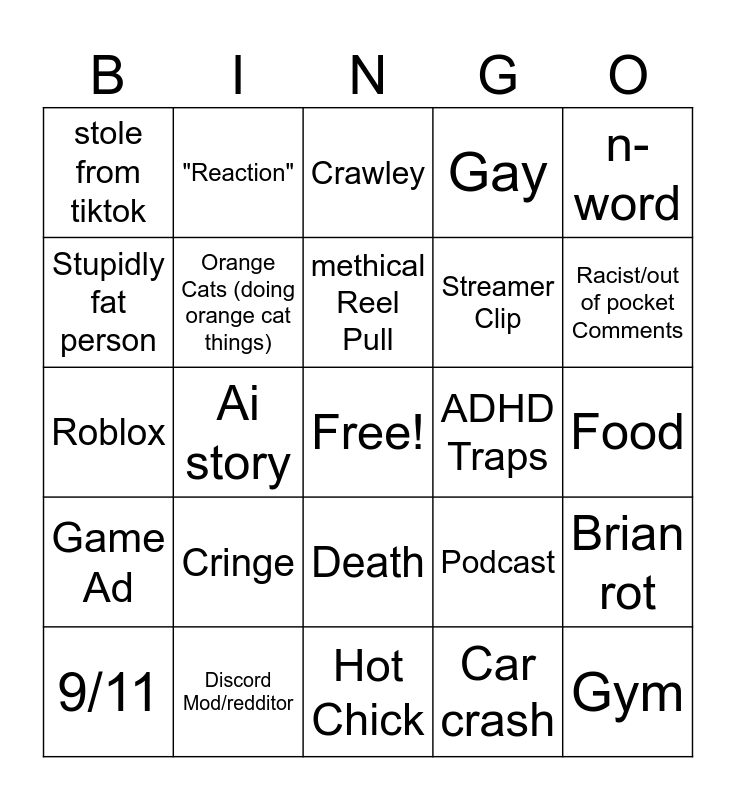 This bingo card has a free space and 24 words: 9/11, Cringe, methical Reel Pull, Car crash, n-word, stole from tiktok, "Reaction", Crawley, ADHD Traps, Food, Roblox, Orange Cats (doing orange cat things), Podcast, Brian rot, Stupidly fat person, Discord Mod/redditor, Hot Chick, Gay, Racist/out of pocket Comments, Game Ad, Ai story, Death, Streamer Clip and Gym.