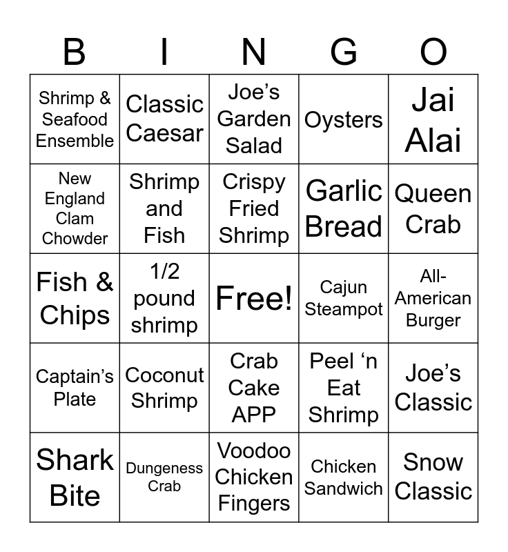 This bingo card has a free space and 27 words: Peel ‘n Eat Shrimp, Crispy Calamari, Garlic Bread, Voodoo Chicken Fingers, New England Clam Chowder, Joe’s Garden Salad, Classic Caesar, Captain’s Plate, Cajun Steampot, Joe’s Classic, Fish & Chips, Oysters, Shark Bite, Dungeness Crab, Queen Crab, Snow Crab, Shrimp and Fish, Crispy Fried Shrimp, Coconut Shrimp, Shrimp & Seafood Ensemble, All-American Burger, Chicken Sandwich, 1/2 pound shrimp, Snow Classic, Crab Cake APP, Jai Alai and Retail.