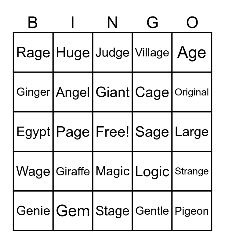 This bingo card has a free space and 24 words: Giraffe, Gem, Giant, Genie, Age, Rage, Ginger, Huge, Sage, Magic, Cage, Egypt, Logic, Strange, Angel, Gentle, Large, Judge, Original, Page, Pigeon, Wage, Village and Stage.