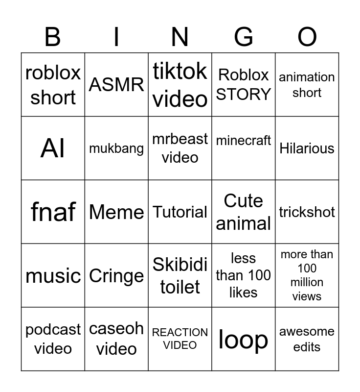 This bingo card has a free space and 24 words: Cringe, caseoh video, mrbeast video, podcast video, animation short, roblox short, AI, ASMR, Cute animal, Skibidi toilet, minecraft, fnaf, less than 100 likes, more than 100 million views, mukbang, loop, trickshot, tiktok video, Hilarious, Meme, awesome edits, music, Roblox STORY and REACTION VIDEO.