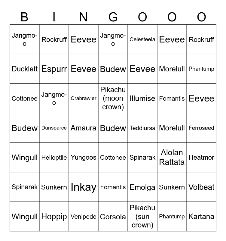 This bingo card has a free space and 90 words: Pidgey, Pikachu (sun crown), Pikachu (moon crown), Hoothoot, Hoothoot, Hoppip, Hoppip, Wingull, Wingull, Snivy, Snivy, Snivy, Cottonee, Cottonee, Ducklett, Ducklett, Ferroseed, Heatmor, Inkay, Inkay, Sunkern, Sunkern, Dunsparce, Solrock, Budew, Budew, Helioptile, Helioptile, Tyrunt, Tyrunt, Yungoos, Fomantis, Fomantis, Jangmo-o, Jangmo-o, Jangmo-o, Eevee, Eevee, Eevee, Eevee, Eevee, Eevee, Spinarak, Spinarak, Volbeat, Illumise, Gible, Venipede, Venipede, Emolga, Espurr, Espurr, Espurr, Durant, Golett, Golett, Phantump, Phantump, Alolan Rattata, Alolan Rattata, Teddiursa, Teddiursa, Mudkip, Mudkip, Carvanha, Deino, Deino, Amaura, Amaura, Crabrawler, Crabrawler, Morelull, Morelull, Corsola, Rockruff, Rockruff, Rockruff, Rockruff, Vullaby, Vullaby, Kartana, Celesteela, Buzzwhole, Pheromosa, Xurkitree, Necrozma, Necrozma, Necrozma, Unown and Unown.