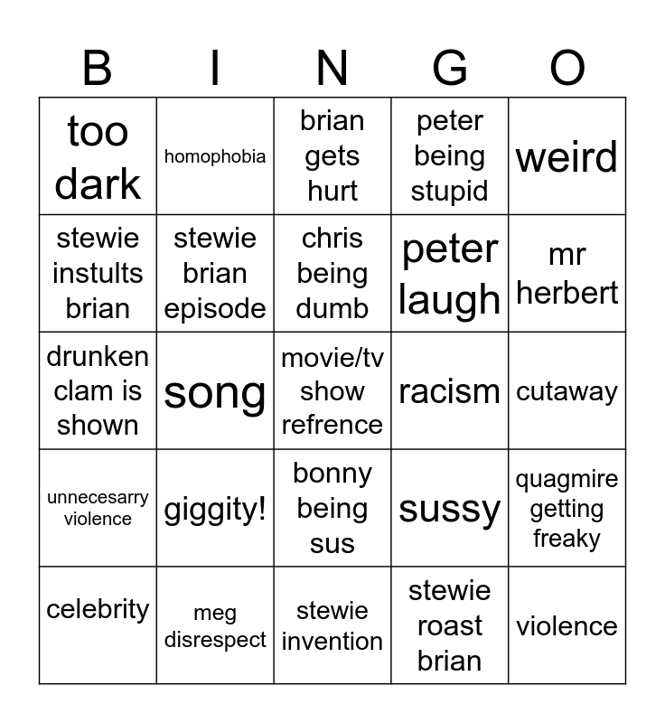 This bingo card has a free space and 24 words: giggity!, meg disrespect, chris being dumb, celebrity, weird, too dark, stewie instults brian, homophobia, racism, bonny being sus, peter laugh, drunken clam is shown, sussy, quagmire getting freaky, stewie brian episode, stewie roast brian, cutaway, brian gets hurt, mr herbert, song, violence, unnecesarry violence, peter being stupid and stewie invention.