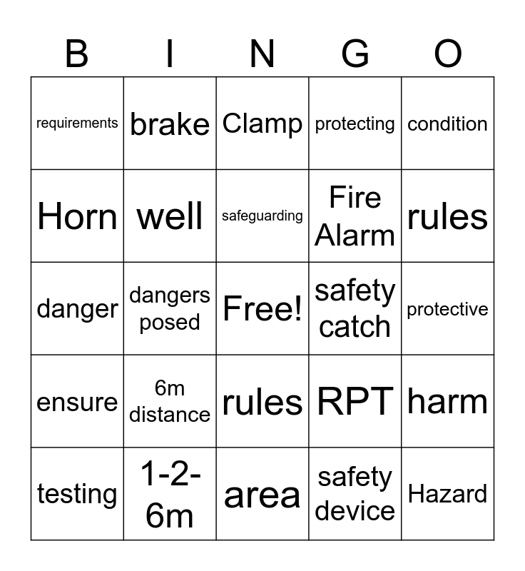 This bingo card has a free space and 28 words: harm, protective gear, Fire Alarm, safety device, Horn, Clamp, brake, ensure, safety catch, testing, danger, protecting, 1-2-6m, area, rules, problems, 6m distance, well, safeguarding, rules, requirements, Risk, Hazard, dangers posed, protective, RPT, condition and stability.