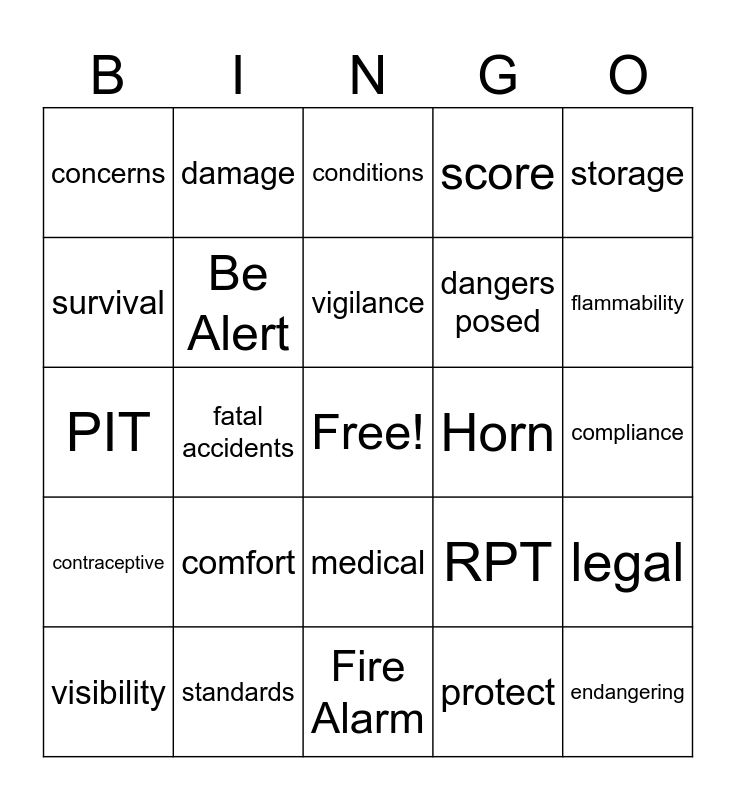 This bingo card has a free space and 26 words: medical, protect, vigilance, standards, storage, concerns, survival, damage, compliance, RPT, dangers posed, PIT, legal, visibility, fatal accidents, structural, score, contraceptive, conditions, endangering, flammability, Fire Alarm, Horn, comfort, Be Alert and Safety Saves.