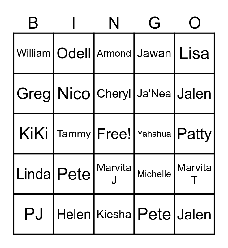 This bingo card has a free space and 24 words: PJ, Pete, Cheryl, Pete, Lisa, William, Odell, Armond, Yahshua, Patty, KiKi, Nico, Michelle, Marvita T, Greg, Helen, Kiesha, Jawan, Jalen, Linda, Tammy, Marvita J, Ja'Nea and Jalen.