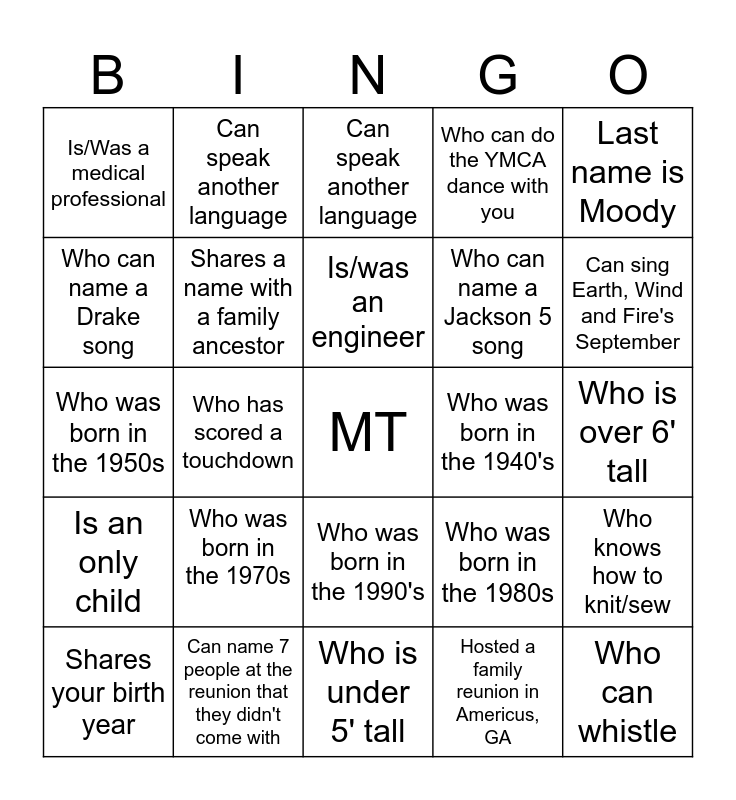 This bingo card has a free space and 34 words: Birthday in July, Hosted a family reunion in Americus, GA, Retired, but still working, Knows the 23rd Psalm, Is an only child, Shares a name with a family ancestor, Last name is Moody, Shares your birth year, Can speak another language, Has lived in at least three cities, Is/was an engineer, Can speak another language, Currently a student, Who was born in the 1960's, Who was born in the 1940's, Can sing Earth, Wind and Fire's September, Can name 7 people at the reunion that they didn't come with, Who was born in the 1950s, Who was born in the 1970s, Who was born in the 1980s, Who was born in the 1990's, Who was born in the 2000's, Is/Was a medical professional, Who is over 6' tall, Who is under 5' tall, Who can whistle, Who can do the YMCA dance with you, Who can dance the Hustle, Who can name a Jackson 5 song, Who can name a Drake song, Who has hit a home run, Who has scored a touchdown, Who knows how to knit/sew and Who is a veteran.