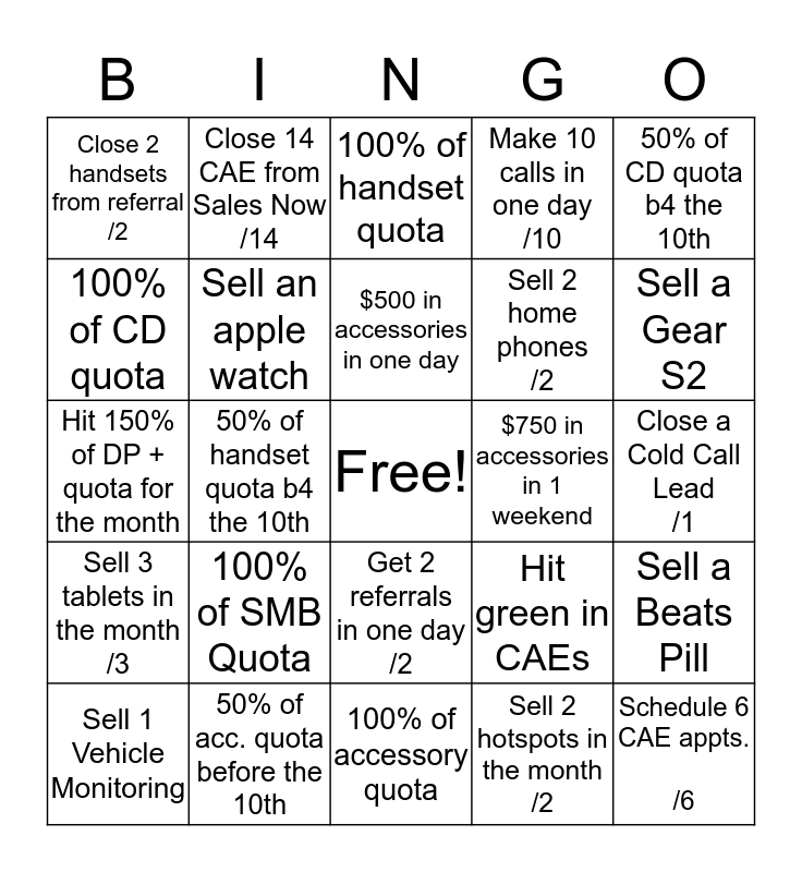 This bingo card has a free space and 24 words: 100% of SMB Quota, 50% of acc. quota before the 10th, $500 in accessories in one day, Sell 1 Vehicle Monitoring, 50% of CD quota b4 the 10th, Close 2 handsets from referral /2, 100% of CD quota, Close 14 CAE from Sales Now /14, $750 in accessories in 1 weekend, Get 2 referrals in one day /2, Sell 2 home phones /2, Hit 150% of DP + quota for the month, Hit green in CAEs, Sell a Beats Pill, Sell an apple watch, Sell 2 hotspots in the month /2, Close a Cold Call Lead /1, 100% of handset quota, Sell a Gear S2, 50% of handset quota b4 the 10th, Schedule 6 CAE appts. /6, Sell 3 tablets in the month /3, Make 10 calls in one day /10 and 100% of accessory quota.