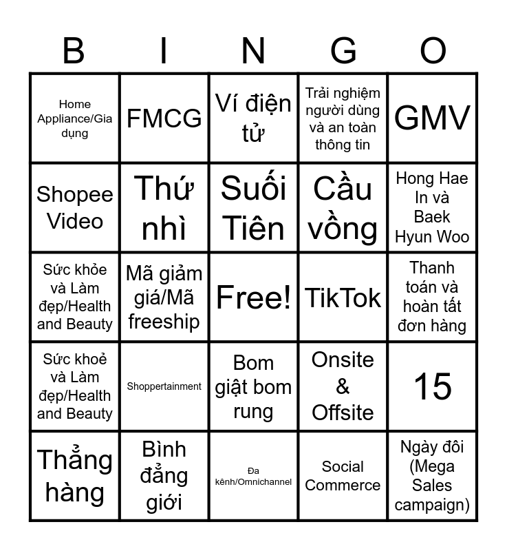This bingo card has a free space and 25 words: Shoppertainment, Đa kênh/Omnichannel, Suối Tiên, Thẳng hàng, GMV, Home Appliance/Gia dụng, Shopee Video, FMCG, TikTok, Bom giật bom rung, Cầu vồng, Sức khỏe và Làm đẹp/Health and Beauty, Onsite & Offsite, 15, Thứ nhì, 12 tháng, Thanh toán và hoàn tất đơn hàng, Ví điện tử, Hong Hae In và Baek Hyun Woo, Mã giảm giá/Mã freeship, Ngày đôi (Mega Sales campaign), Bình đẳng giới, Sức khoẻ và Làm đẹp/Health and Beauty, Trải nghiệm người dùng và an toàn thông tin and Social Commerce.