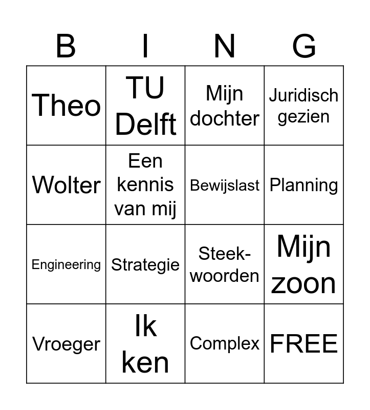This bingo card has 16 words: Vroeger, Ik ken, Mijn dochter, Juridisch gezien, Wolter, TU Delft, Steek- woorden, Mijn zoon, Theo, Een kennis van mij, Complex, Planning, Engineering, Strategie, Bewijslast and FREE.