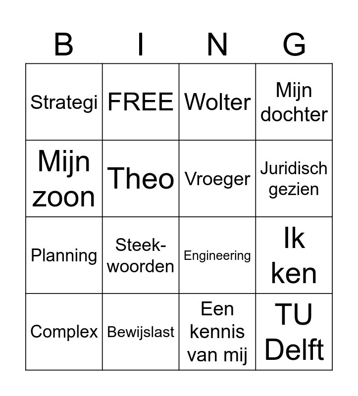 This bingo card has 16 words: Bewijslast, Ik ken, Wolter, Strategi, Planning, FREE, Engineering, Een kennis van mij, Mijn zoon, Theo, Complex, Mijn dochter, Steek- woorden, Juridisch gezien, Vroeger and TU Delft.