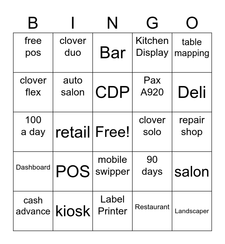 This bingo card has a free space and 24 words: POS, kiosk, CDP, cash advance, table mapping, free pos, clover flex, clover duo, clover solo, mobile swipper, Pax A920, 100 a day, 90 days, salon, auto salon, Restaurant, repair shop, Bar, Deli, retail, Landscaper, Dashboard, Kitchen Display and Label Printer.