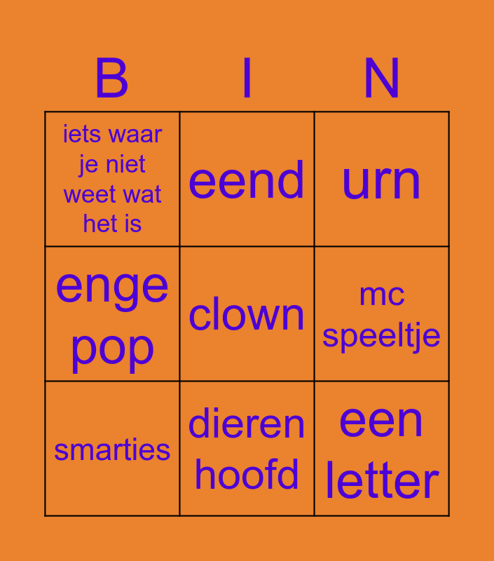 This bingo card has a free space and 8 words: mc speeltje, urn, eend, smarties, iets waar je niet weet wat het is, een letter, enge pop and dieren hoofd.