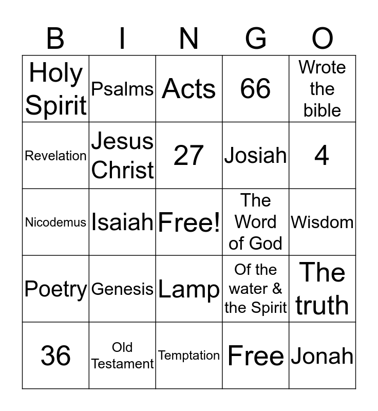This bingo card has a free space and 24 words: Genesis, Old Testament, 27, 36, Wrote the bible, Holy Spirit, Revelation, Psalms, The Word of God, Lamp, Josiah, Nicodemus, Of the water & the Spirit, The truth, Jesus Christ, Free, Wisdom, Acts, 4, Isaiah, Jonah, Poetry, 66 and Temptation.