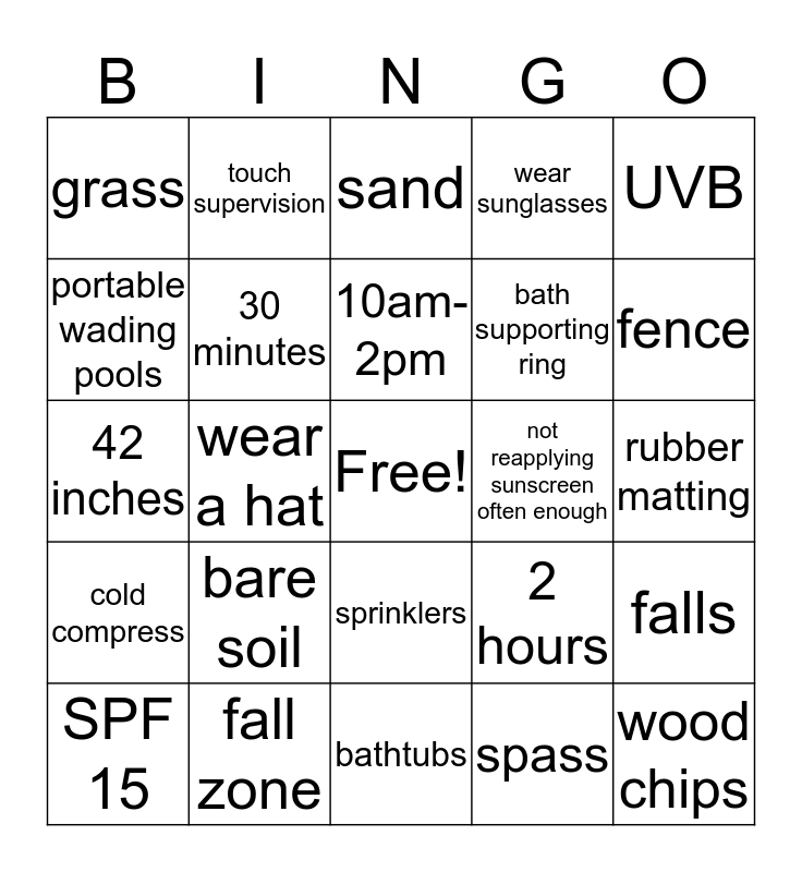 This bingo card has a free space and 36 words: sunburn, skin cancer, 3 years, 30 minutes, 2 hours, cold compress, 10am-2pm, stars system, UVB, Sun Protection Factor, wear a hat, wear sunglasses, play in the shade, not reapplying sunscreen often enough, fence, grass, concrete, bare soil, wood chips, sand, rubber matting, falls, fall zone, SPF 15, bathtubs, touch supervision, 42 inches, glass, bath supporting ring, portable wading pools, hot tubs, saunas, spass, sprinklers, water hoses and small individual buckets.