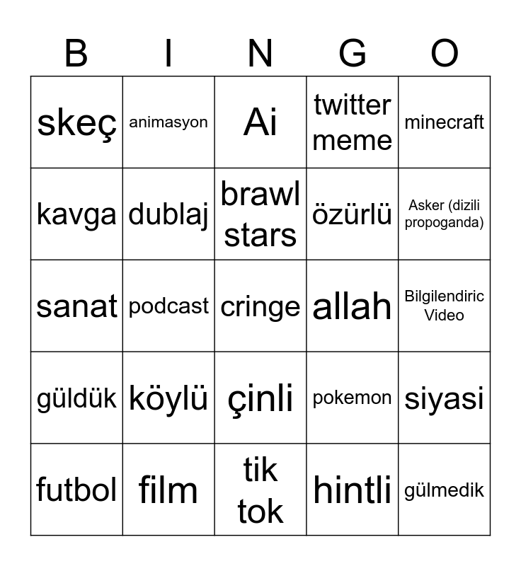 This bingo card has a free space and 24 words: köylü, film, brawl stars, futbol, minecraft, skeç, kavga, animasyon, allah, çinli, özürlü, sanat, pokemon, siyasi, dublaj, hintli, Bilgilendiric Video, Ai, Asker (dizili propoganda), podcast, gülmedik, güldük, twitter meme and tik tok.