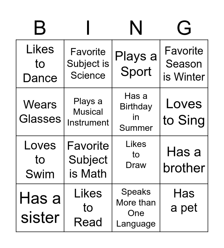 This bingo card has 16 words: Likes to Read, Has a brother, Plays a Sport, Likes to Dance, Loves to Swim, Favorite Subject is Science, Likes to Draw, Speaks More than One Language, Wears Glasses, Plays a Musical Instrument, Has a sister, Favorite Season is Winter, Favorite Subject is Math, Loves to Sing, Has a Birthday in Summer and Has a pet.