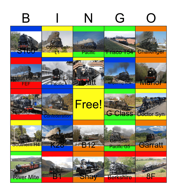 This bingo card has 24 images, a free space and 24 words: K28, B1, Ivatt, River Mite, Challenger, S160, Union Pacific FEF, Cotton Belt L1, G Class, B12, Lake Superior and Ishpeming SC4, Black Five, Canadian Pacific G5, Garratt, Bulleid Pacific, Berkshire, Doctor Syn, Gresley Pacific, Manor, Confederation, 8F, Southern H4, Frisco T54 and Shay.