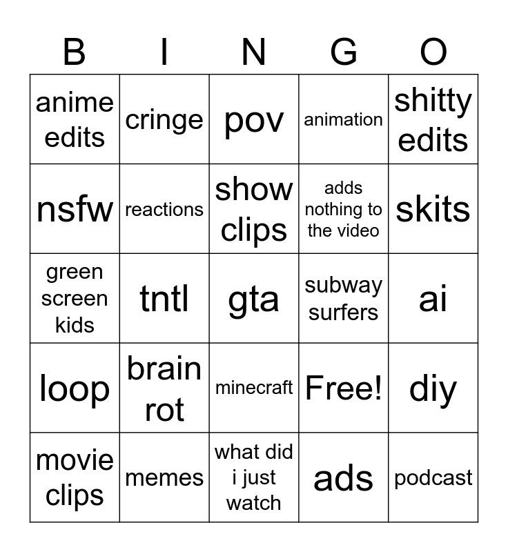 This bingo card has 25 words: brain rot, what did i just watch, show clips, movie clips, shitty edits, anime edits, nsfw, cringe, subway surfers, minecraft, adds nothing to the video, green screen kids, Free!, diy, reactions, podcast, ai, pov, skits, tntl, gta, memes, loop, animation and ads.