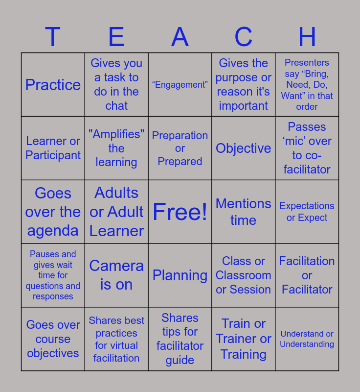 This bingo card has a free space and 28 words: Facilitation or Facilitator, Parking lot, Objective, Train or Trainer or Training, Learner or Participant, “Engagement”, Gives you a task to do in the chat, Pauses and gives wait time for questions and responses, Mentions time, Goes over course objectives, Goes over the agenda, Gives the purpose or reason it's important, Shares best practices for virtual facilitation, Shares tips for facilitator guide, Passes ‘mic’ over to co-facilitator, You see a facilitator’s guide clipping (double black frame), Camera is on, "Amplifies" the learning, Preparation or Prepared, Planning, Practice, Mentions the bingo activity, Understand or Understanding, Adults or Adult Learner, Expectations or Expect, Class or Classroom or Session, Presenters say “Bring, Need, Do, Want” in that order and You get the rocky horror joke.