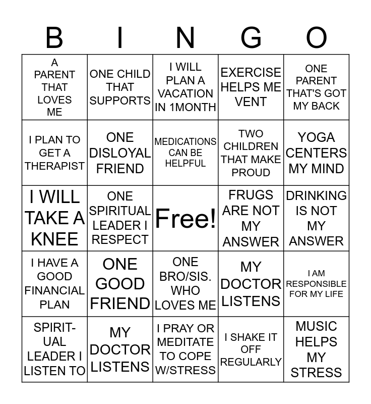 This bingo card has a free space and 24 words: ONE GOOD FRIEND, MY DOCTOR LISTENS, MEDICATIONS CAN BE HELPFUL, SPIRIT-UAL LEADER I LISTEN TO, ONE PARENT THAT'S GOT MY BACK, A PARENT THAT LOVES ME, I PLAN TO GET A THERAPIST, ONE CHILD THAT SUPPORTS, FRUGS ARE NOT MY ANSWER, ONE BRO/SIS. WHO LOVES ME, TWO CHILDREN THAT MAKE PROUD, I WILL TAKE A KNEE, MY DOCTOR LISTENS, I AM RESPONSIBLE FOR MY LIFE, ONE DISLOYAL FRIEND, I SHAKE IT OFF REGULARLY, DRINKING IS NOT MY ANSWER, I WILL PLAN A VACATION IN 1MONTH, YOGA CENTERS MY MIND, ONE SPIRITUAL LEADER I RESPECT, MUSIC HELPS MY STRESS, I HAVE A GOOD FINANCIAL PLAN, EXERCISE HELPS ME VENT and I PRAY OR MEDITATE TO COPE W/STRESS.