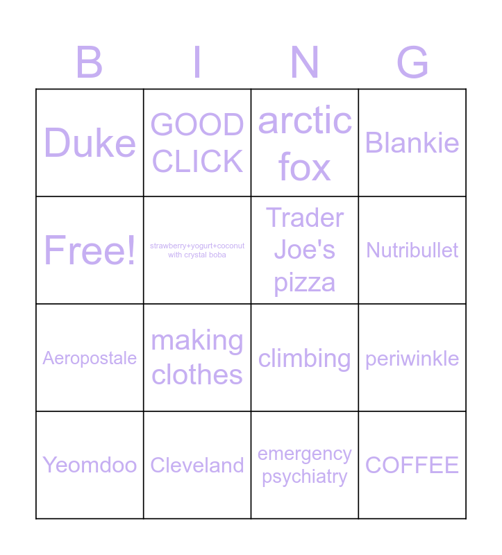 This bingo card has 16 words: Cleveland, periwinkle, arctic fox, Duke, Aeropostale, GOOD CLICK, climbing, emergency psychiatry, Free!, strawberry+yogurt+coconut with crystal boba, Yeomdoo, Blankie, making clothes, Nutribullet, Trader Joe's pizza and COFFEE.